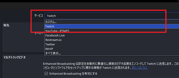 OBSを起動し、「設定 → 配信」タブを開きます。