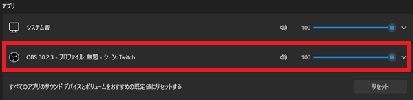 OBSの設定を見直しても音が聞こえない場合は、Windows側の音量ミキサー設定も確認してみましょう。