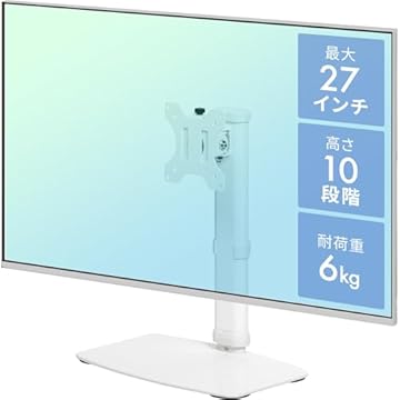 クランプもネジも不要な置き型スタンド式モニターアームです。ガラス天板や中が空洞の天板など、クランプを使えないデスクへの設置に最適な選択肢です。工具なしで手軽に高さ変更ができ、2cmずつ10段階での調節が可能。上に60°・下に20°のチルト調整と、左右30°のスイング、360°のピボット回転にも対応しています。27インチ・6kgまでのモニターに対応しており、まずコストをかけずにモニターアームを試したい方への入門機としておすすめです。